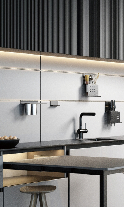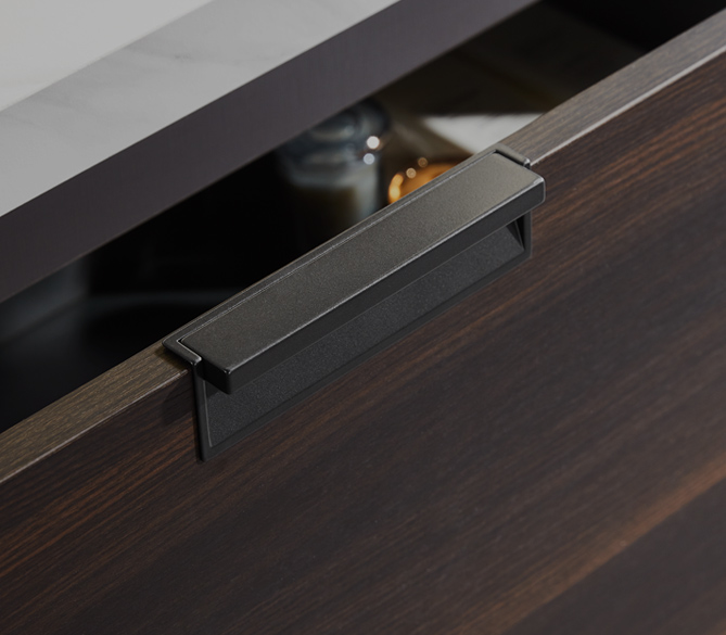 廚房五金包括鉸鏈、拉手、滑軌等,鉸鏈選擇二段力緩沖,滑軌選擇三節連動阻尼